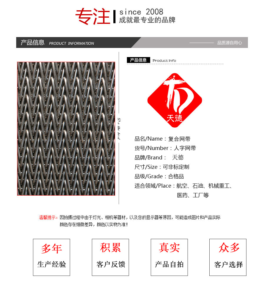 人字形網帶簡介:是由左右交替的網條通過四根直串條聯結而成,此網帶可擋住較小物件的滲漏,組合牢固,抗拉強度大,廣泛應用于石油化纖、熱處理、食品工業等行業,邊緣可加擋片,直接焊接或直接翻邊。